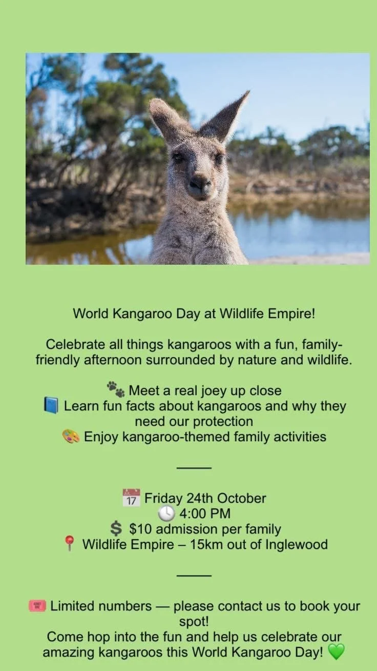 Kangaroo Walk and Talk at wildlife empire Friday 24 October 2025 4:00 pm 6:00 pm Inglewood, QLD, 4387 Australia (map) Google Calendar ICS